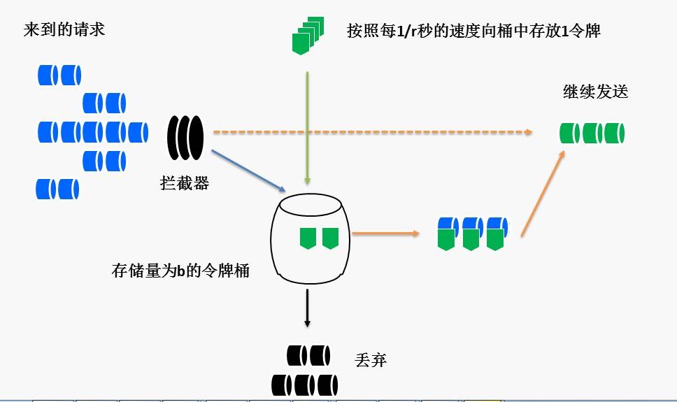 - 令牌以固定速率产生,并缓存到令牌桶中