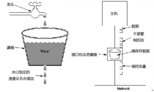 水(请求)从上方倒入水桶,从水桶下方流出(被处理)